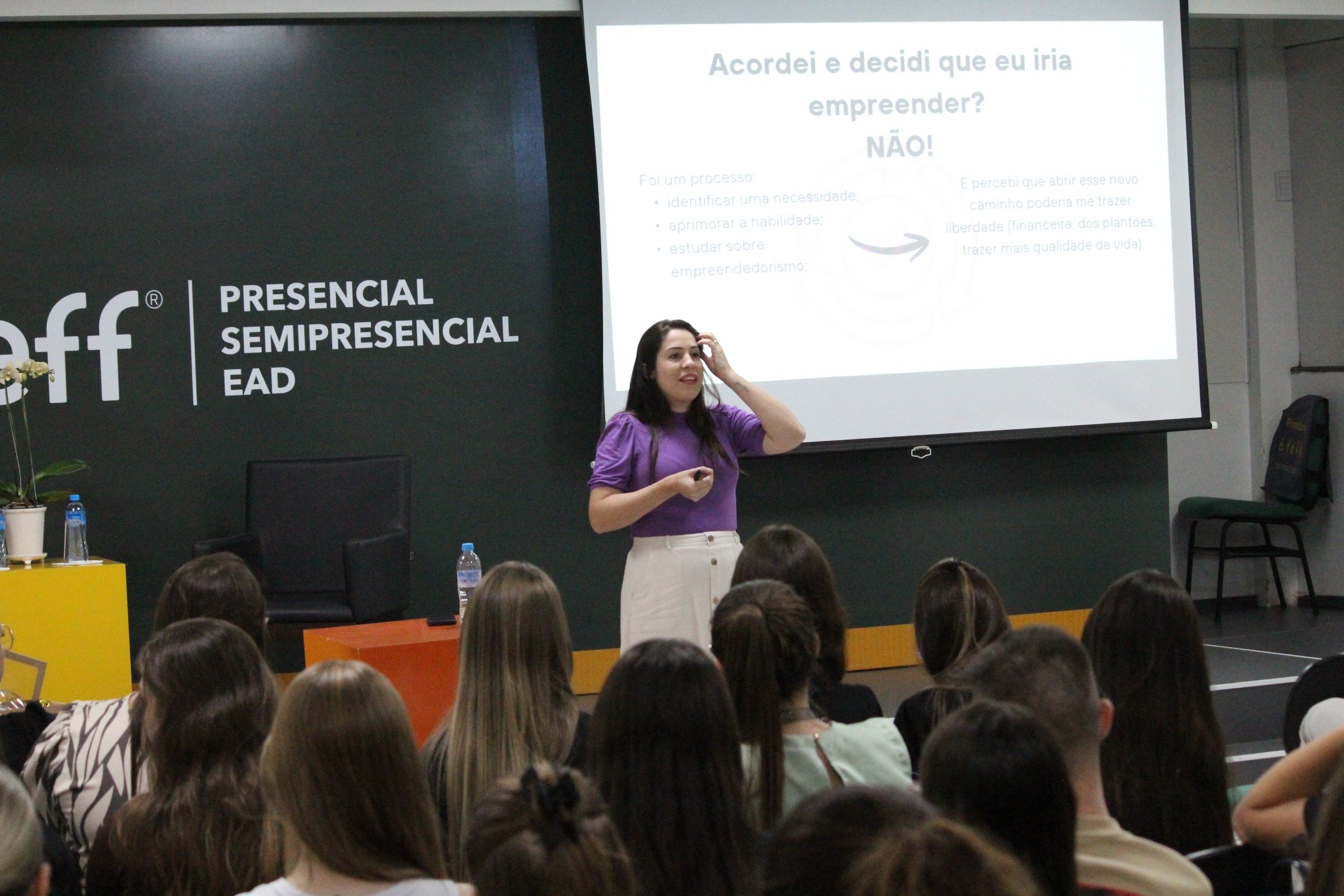 Durante a palestra, ministrada pela enfermeira Aline Lazari, os estudantes puderam ampliar seus horizontes e enxergar novas possibilidades na profissão por meio das vivências compartilhadas pela palestrante no empreendedorismo na profissão.