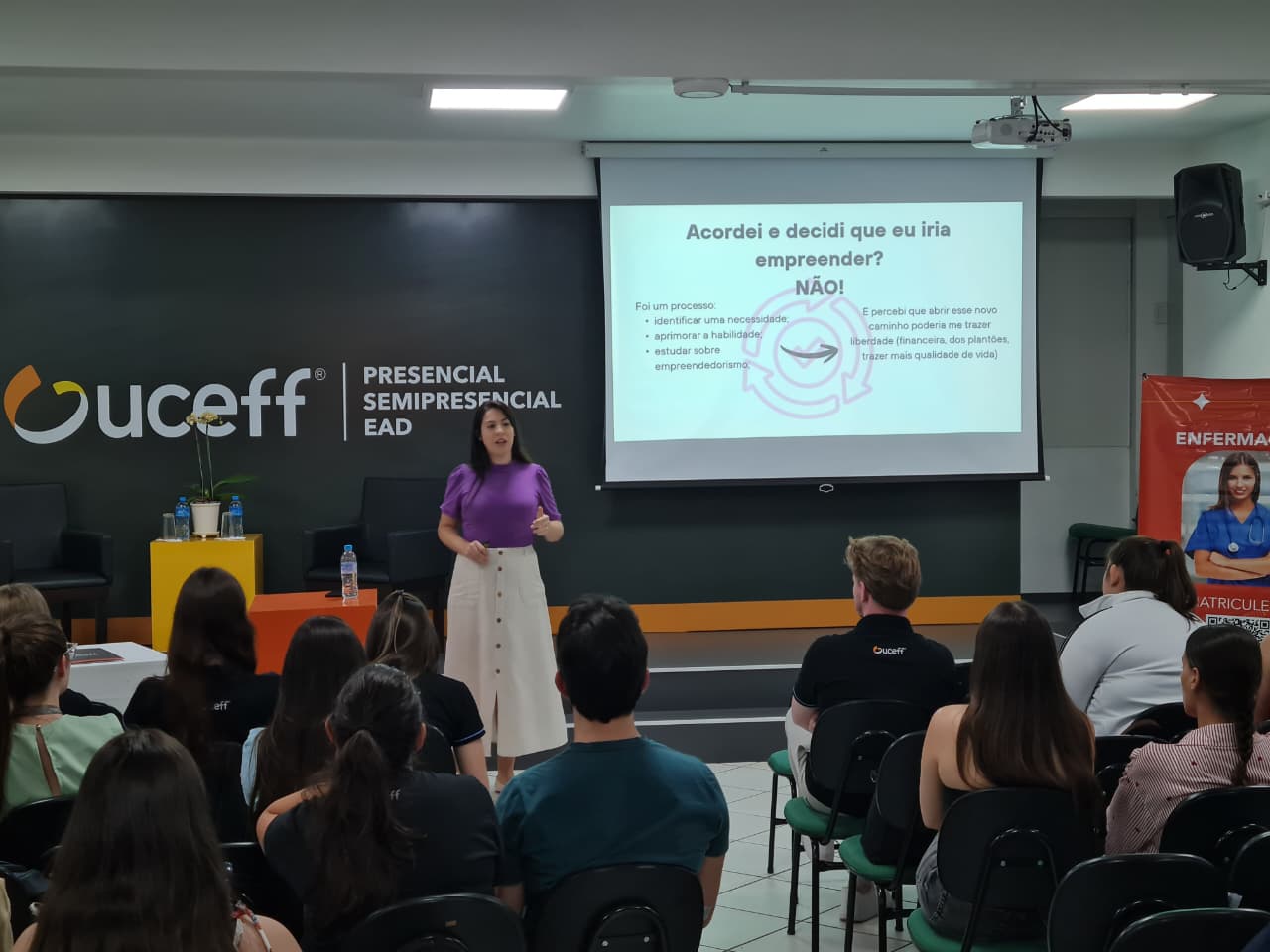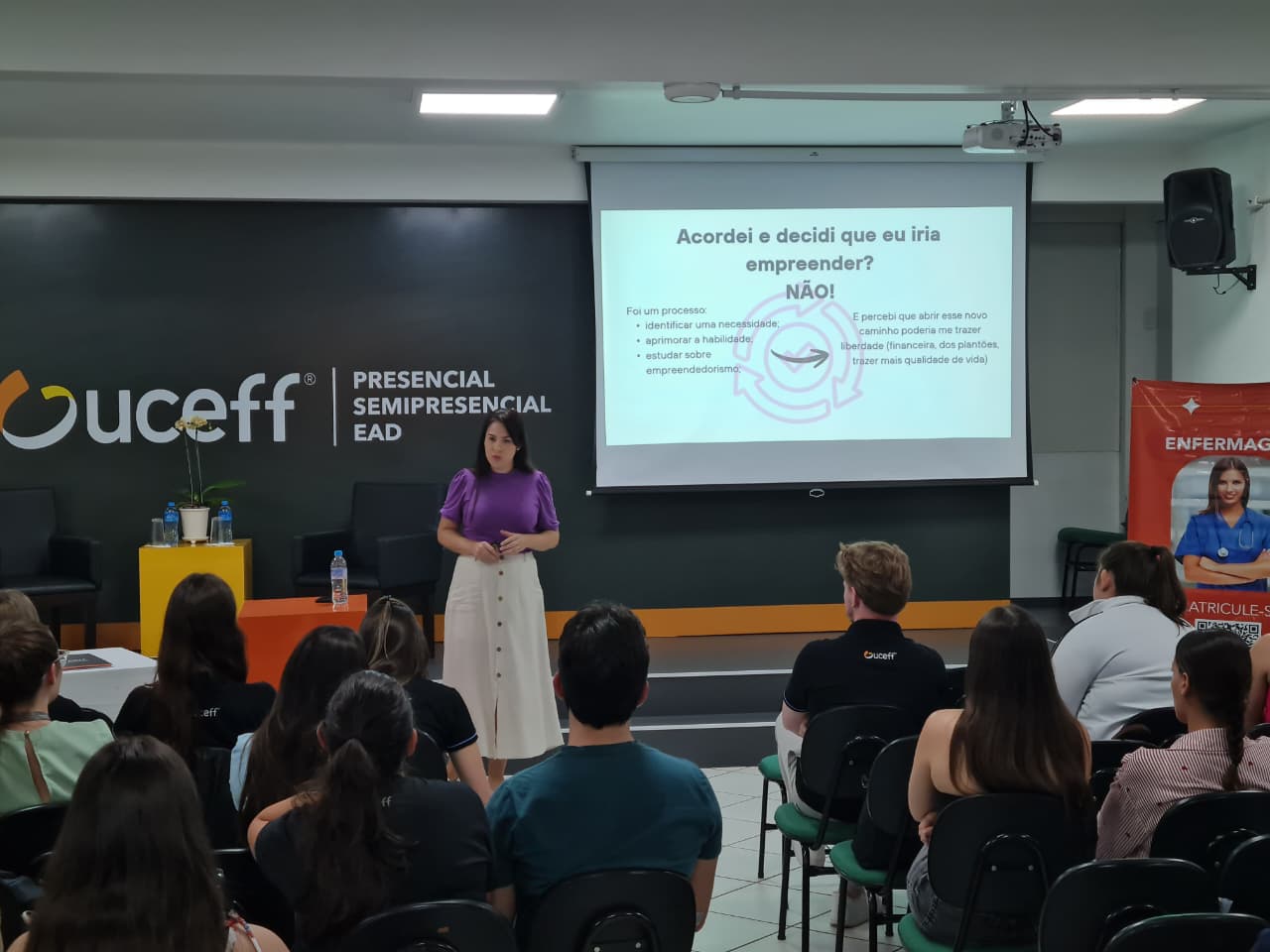 “Essa foi uma palestra que contribuiu muito para ampliar o conhecimento dos acadêmicos sobre as áreas de atuação do profissional de enfermagem, bem como reforçar que eles podem empreender em suas áreas no futuro, caso tenham interesse.”